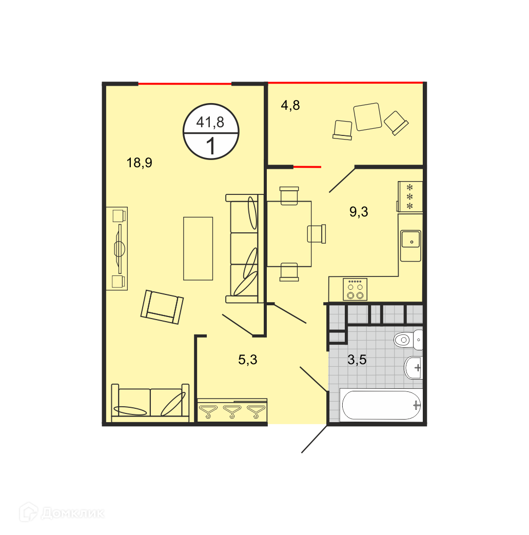 - Общая площадь: 41.33 м²