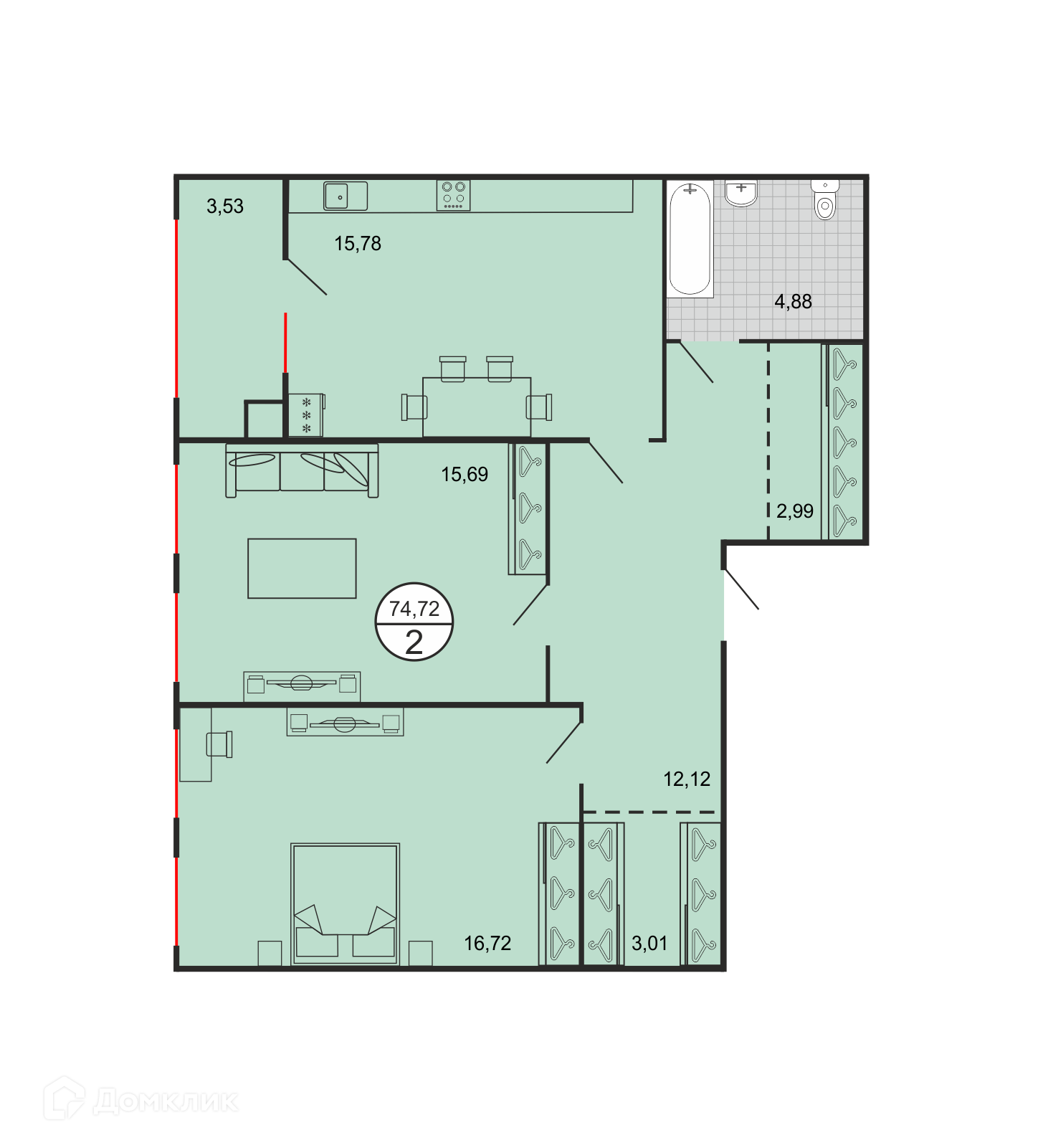 - Общая площадь: 74.72 м²