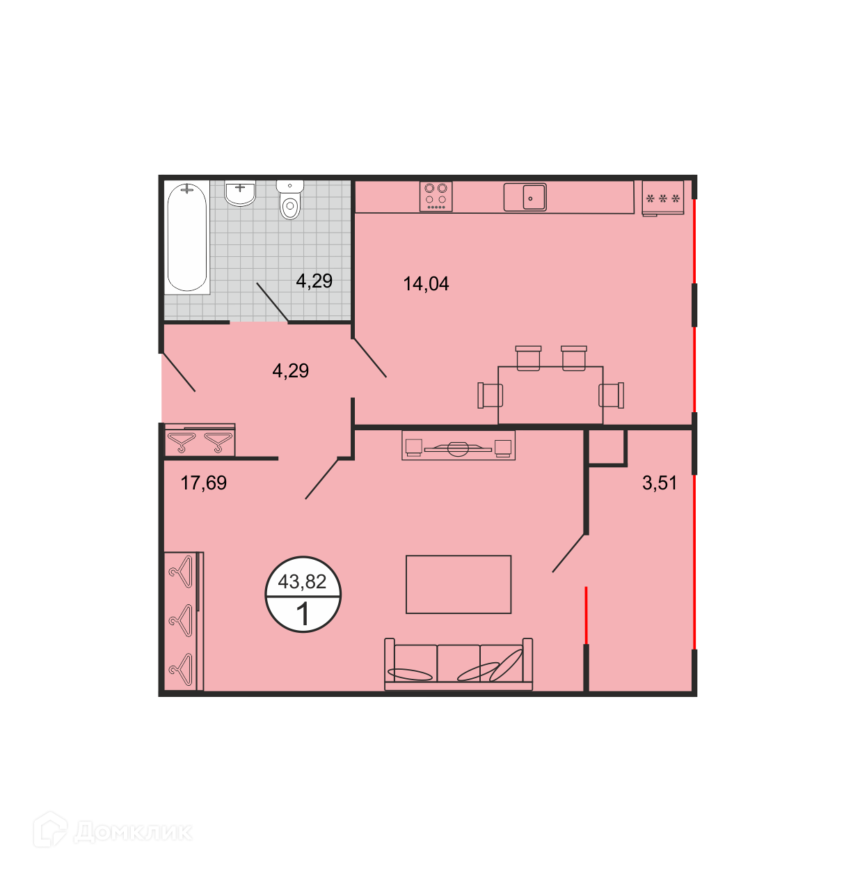 - Общая площадь: 43.82 м²