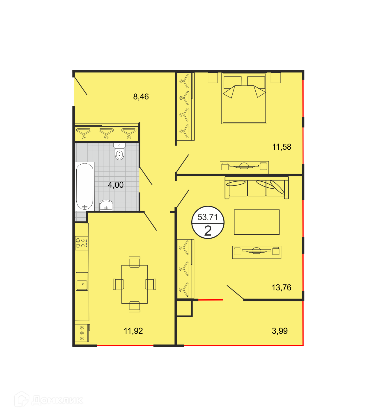 - Общая площадь: 53.71 м²