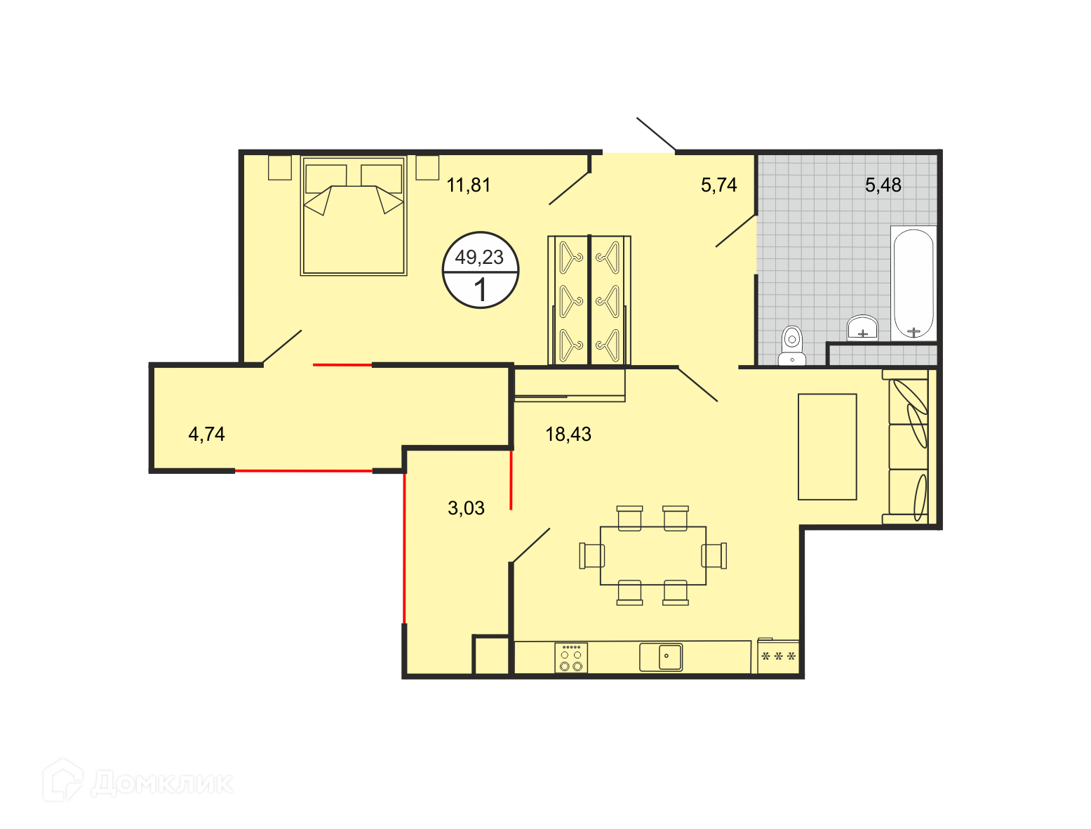 - Общая площадь: 49.23 м²