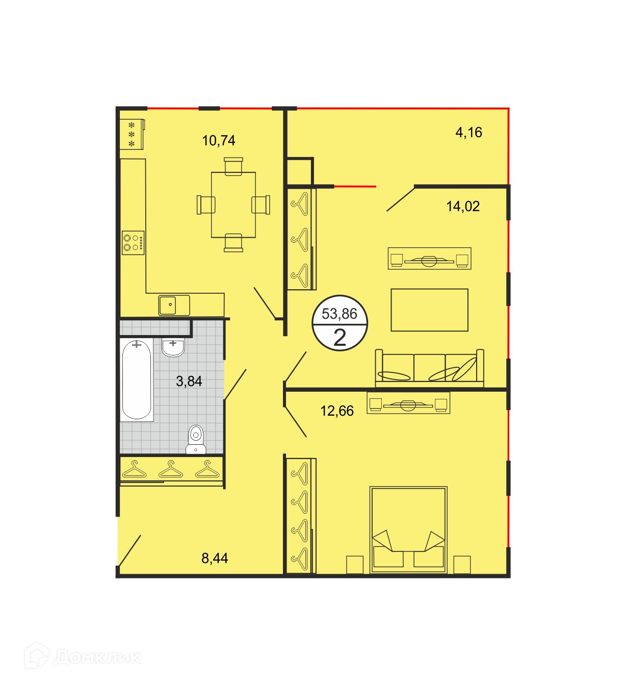 - Общая площадь: 53.86 м²