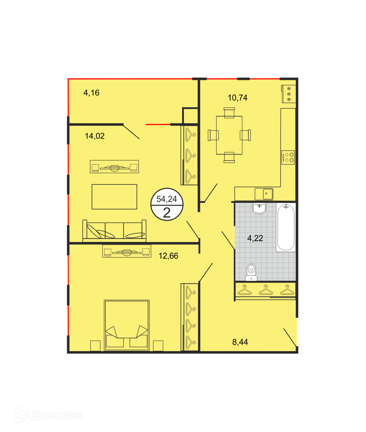 - Общая площадь: 54.24 м²