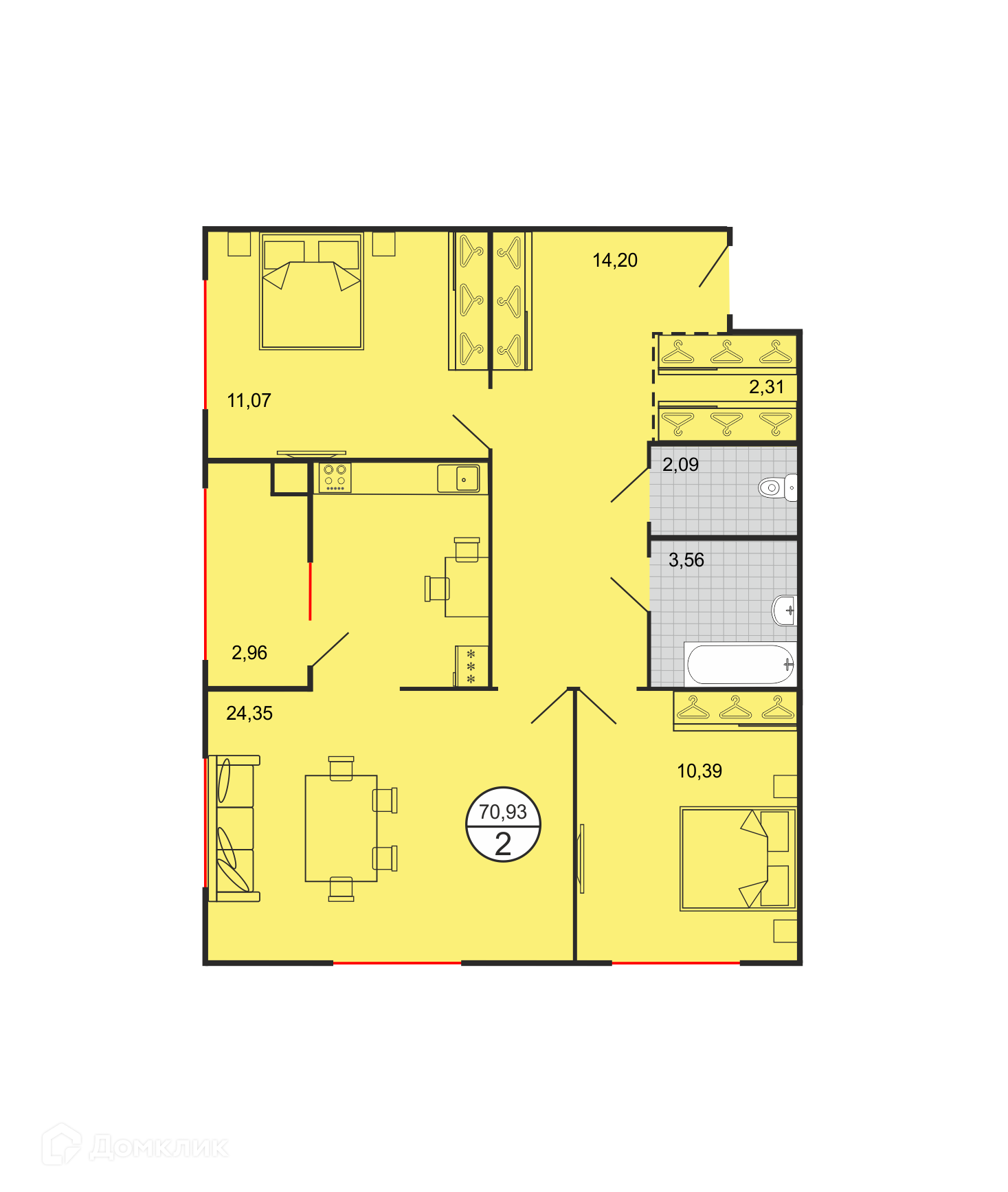 - Общая площадь: 70.93 м²