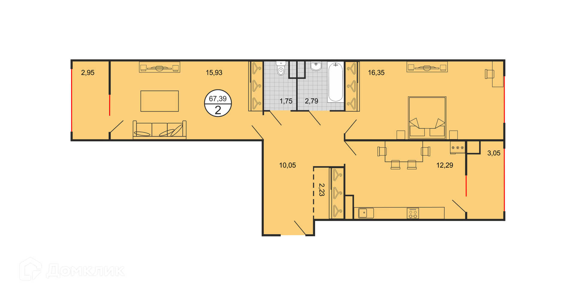 - Общая площадь: 67.35 м²