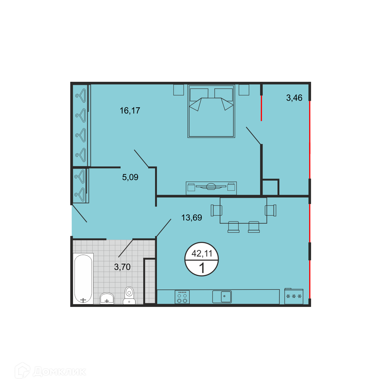 - Общая площадь: 42.11 м²
