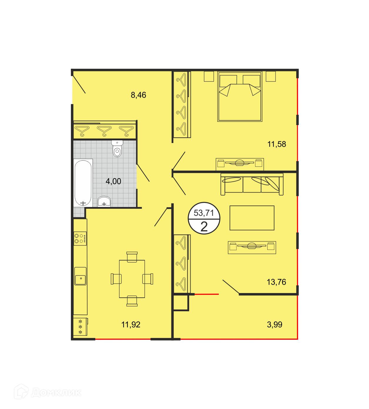 - Общая площадь: 53.71 м²