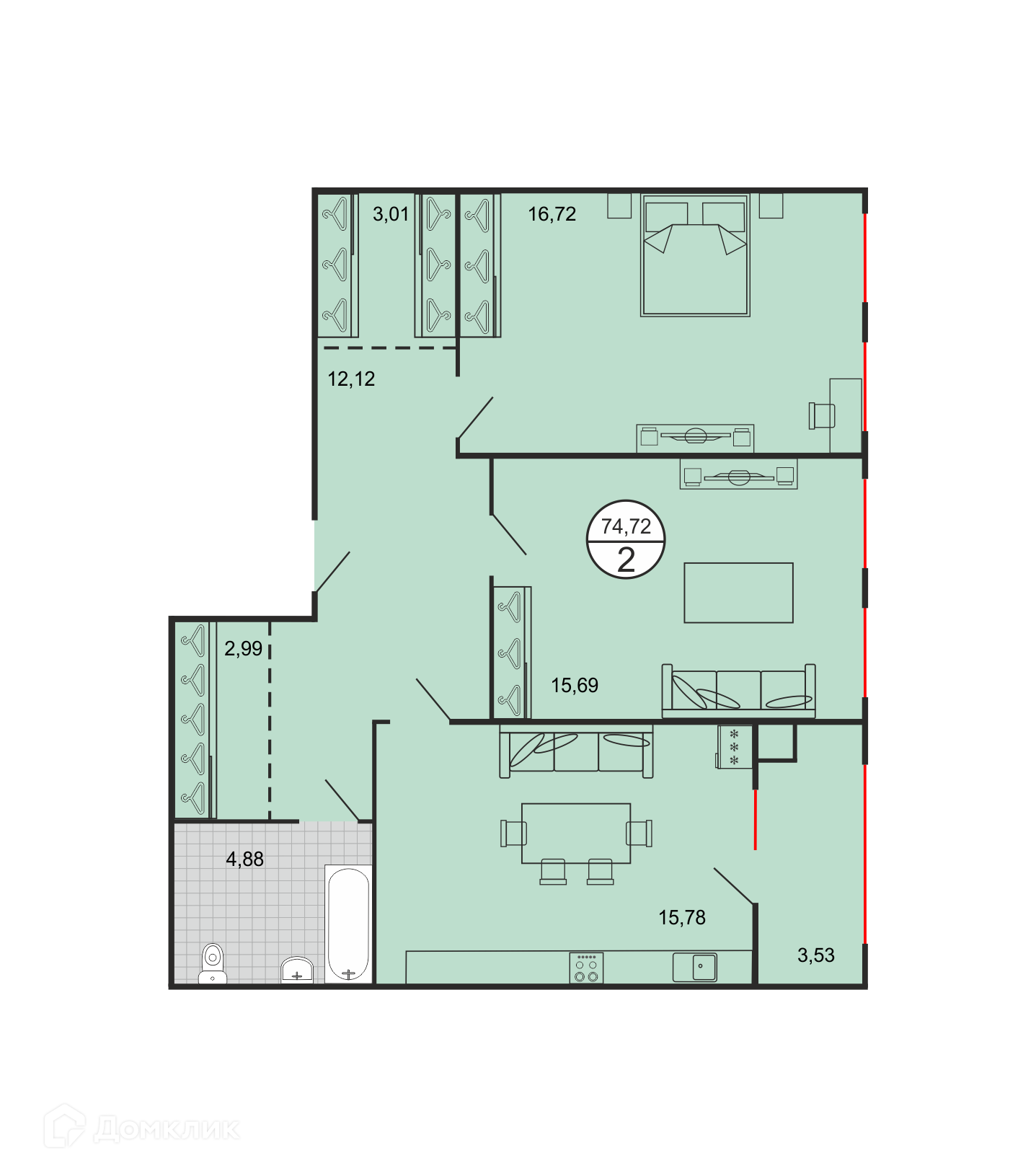 - Общая площадь: 74.72 м²