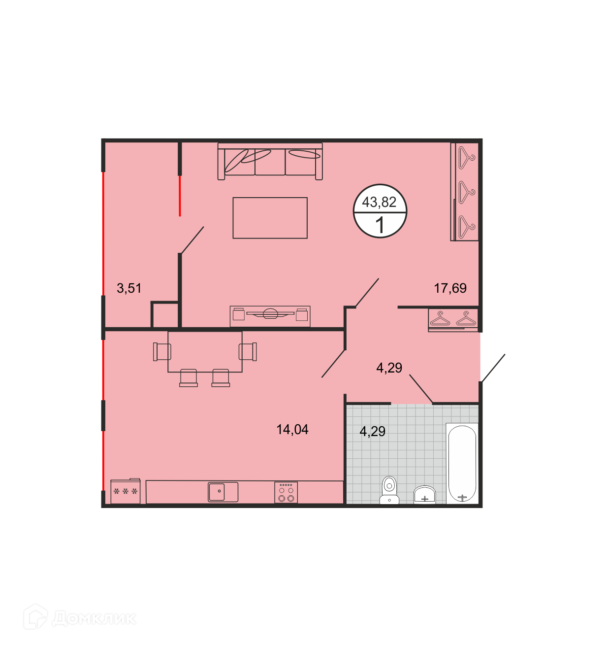 - Общая площадь: 43.82 м²