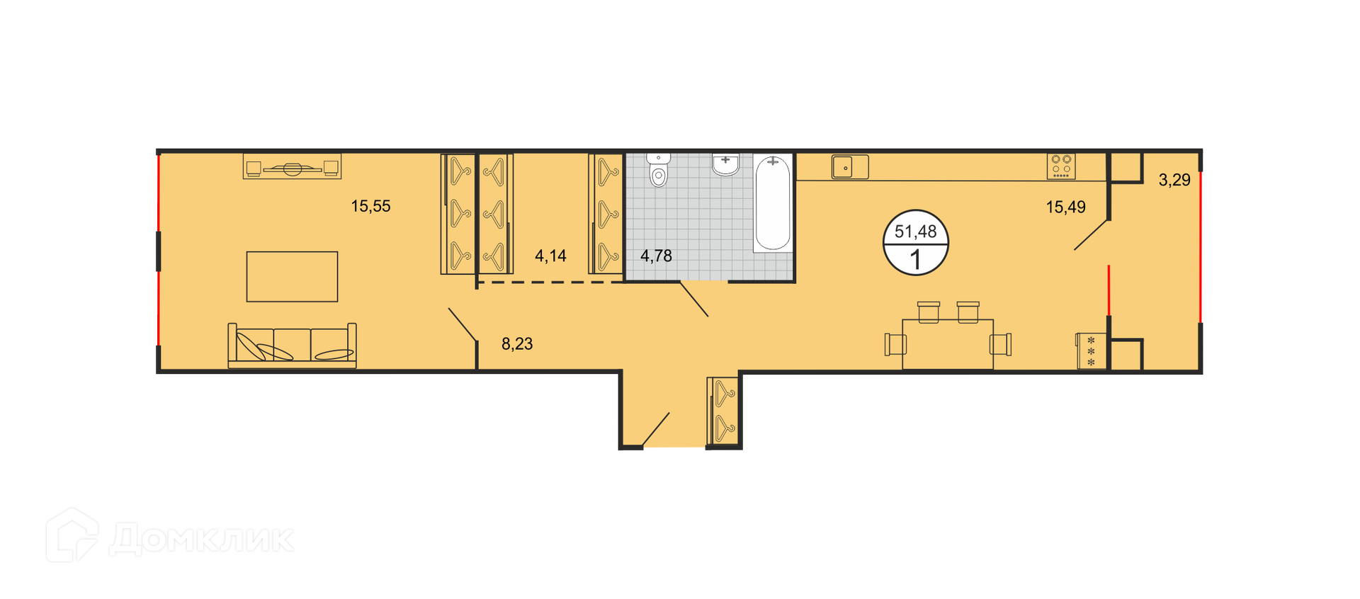 - Общая площадь: 51.48 м²