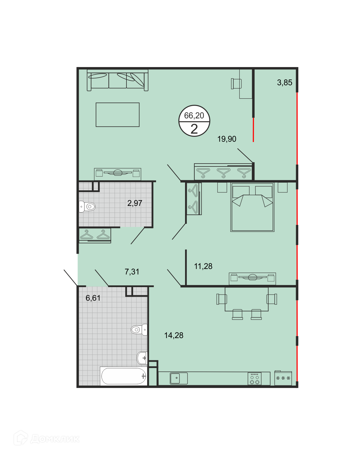 - Общая площадь: 66.2 м²