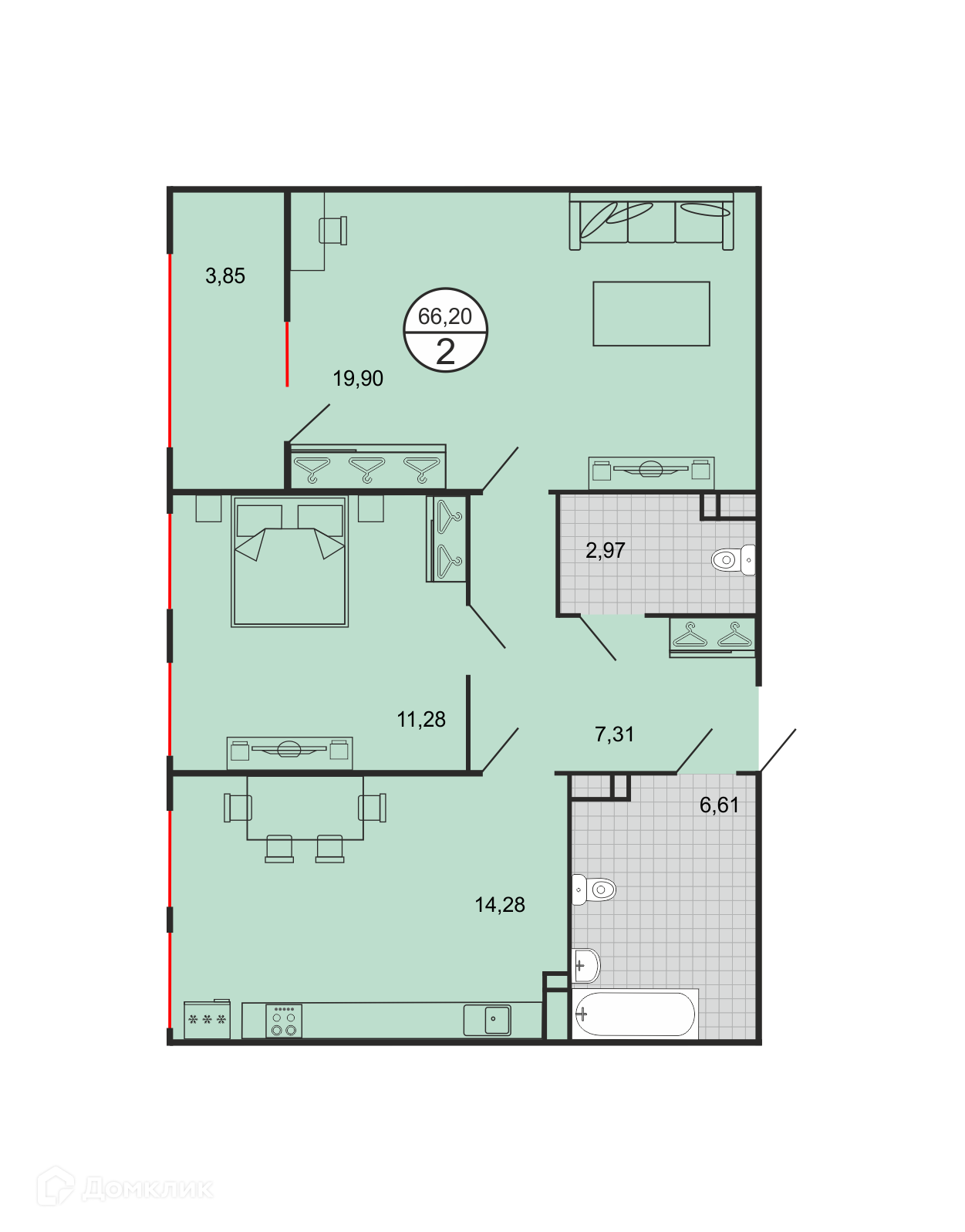 - Общая площадь: 66.2 м²