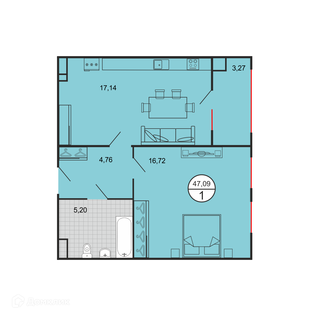 - Общая площадь: 47.09 м²