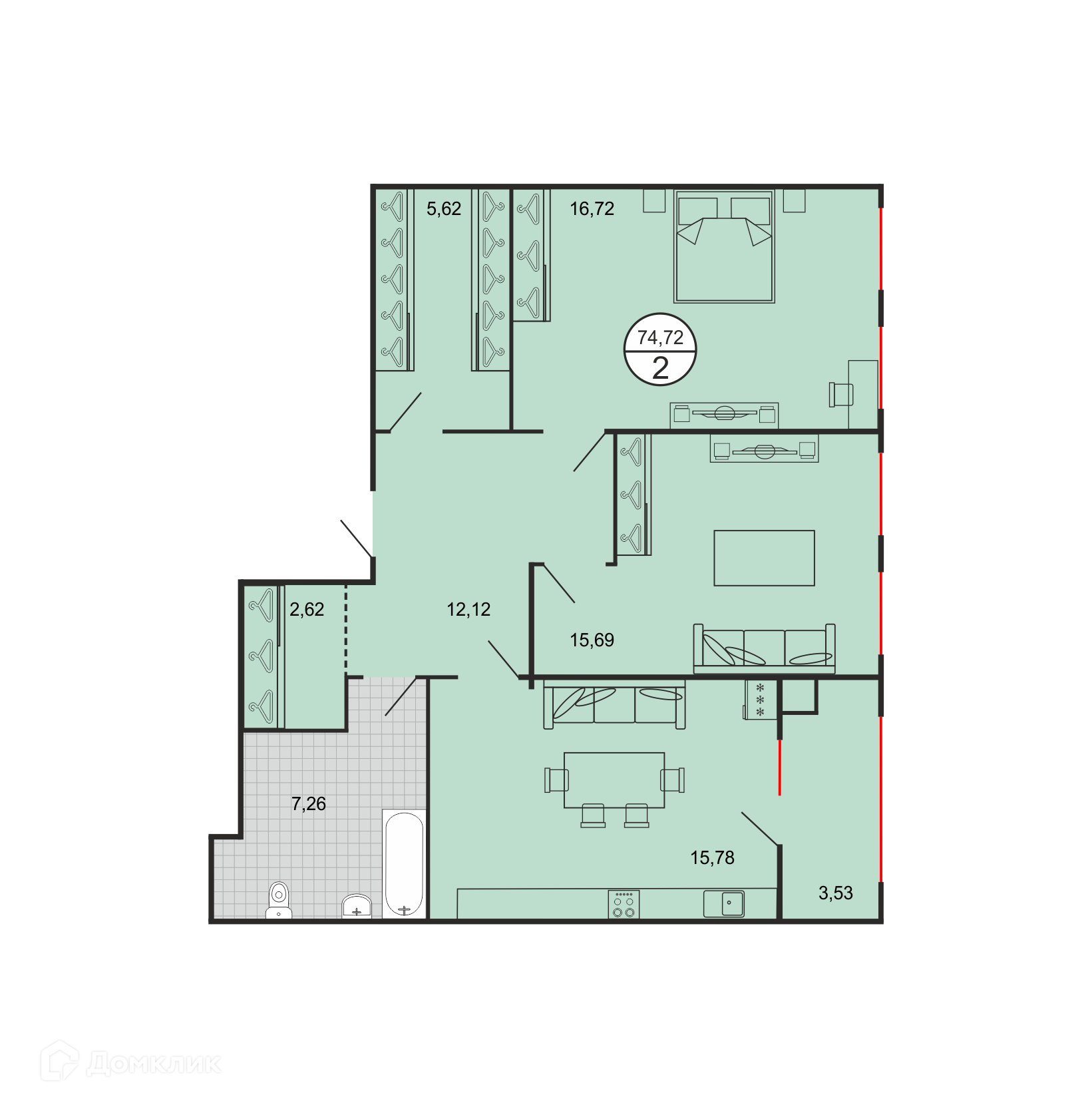 - Общая площадь: 74.72 м²