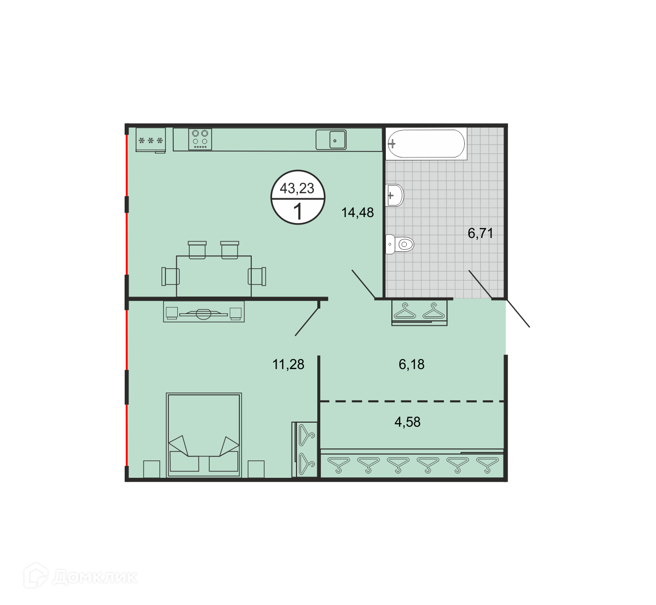 - Общая площадь: 43.23 м²