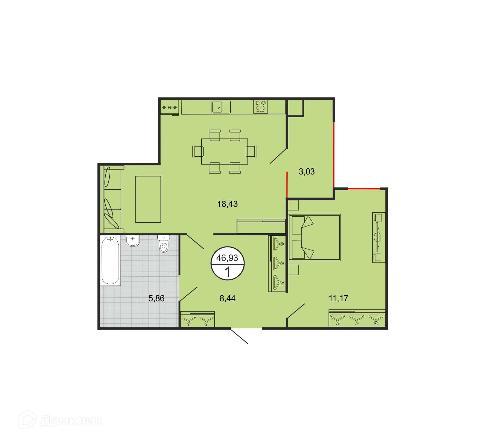 - Общая площадь: 46.93 м²