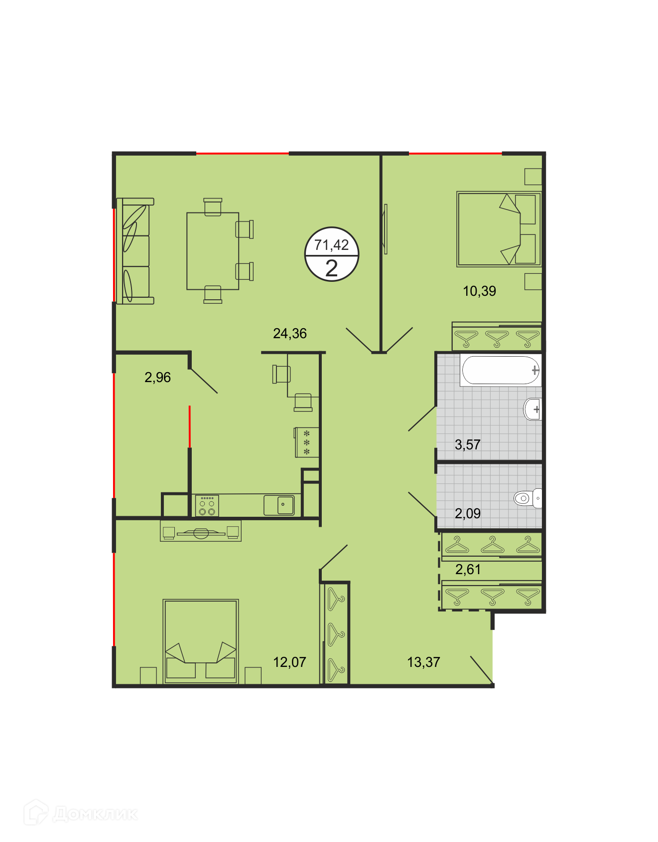 - Общая площадь: 71.42 м²