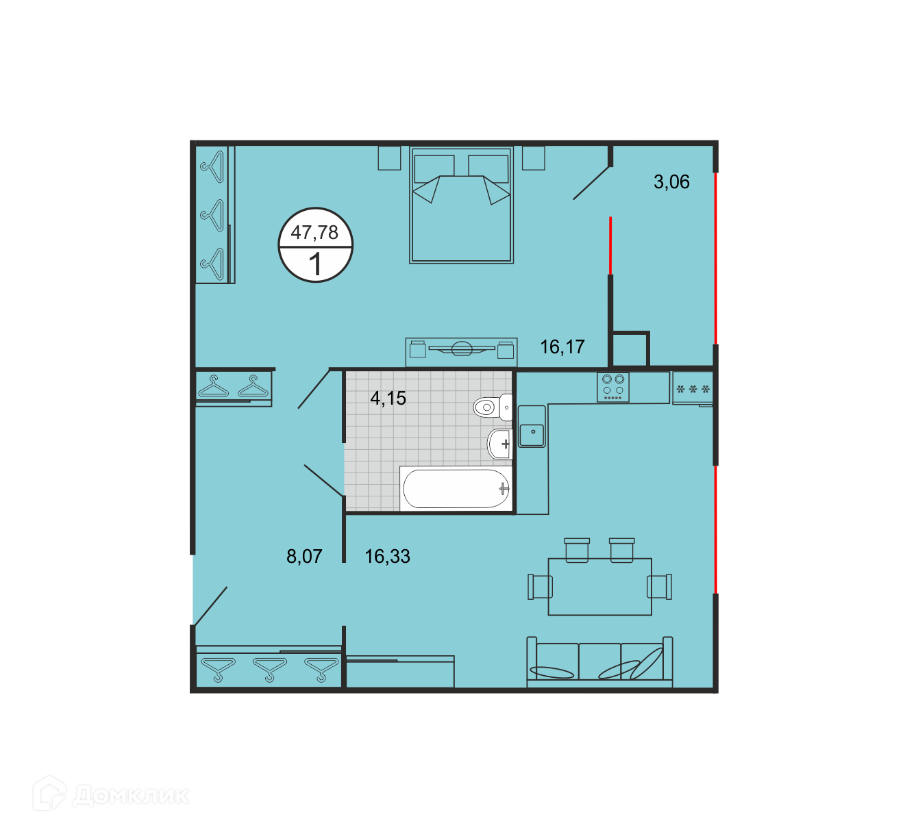 - Общая площадь: 47.78 м²