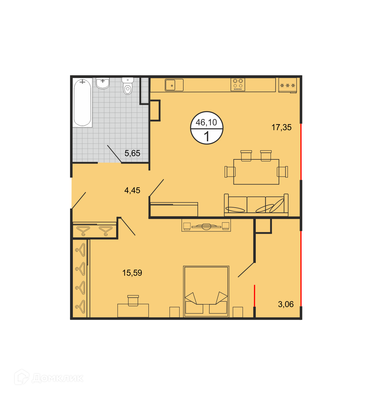 - Общая площадь: 46.1 м²
