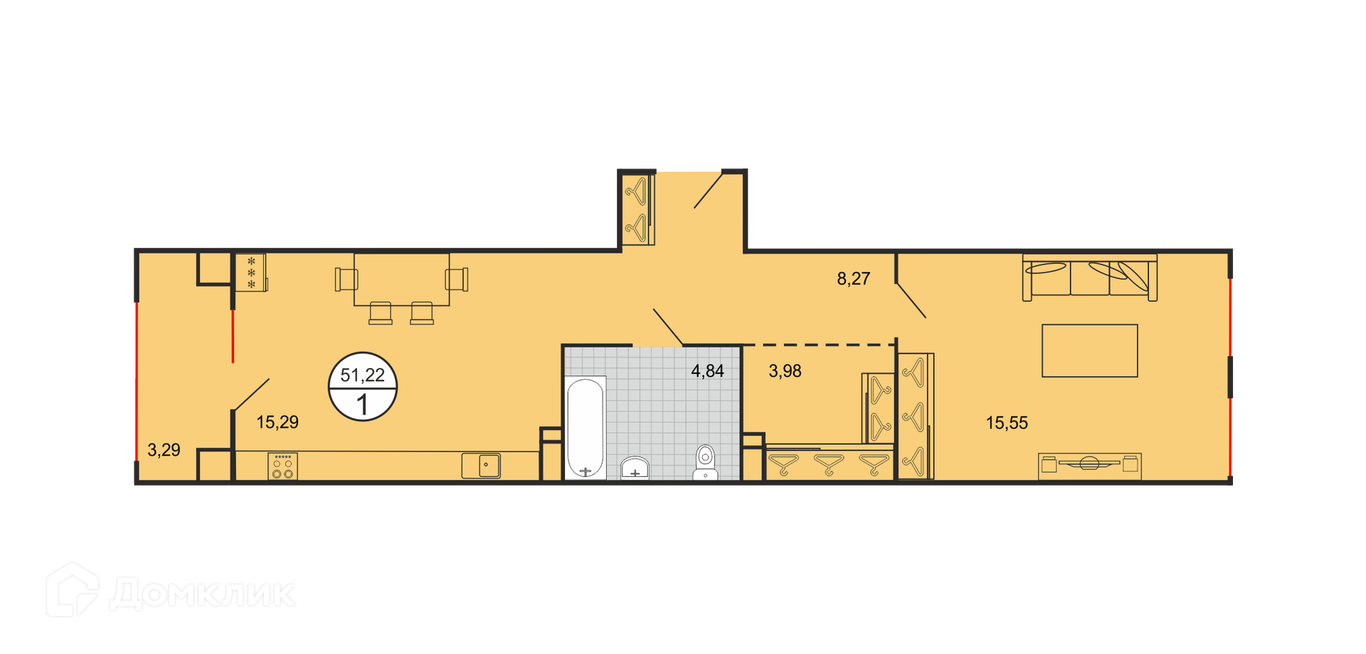 - Общая площадь: 51.22 м²