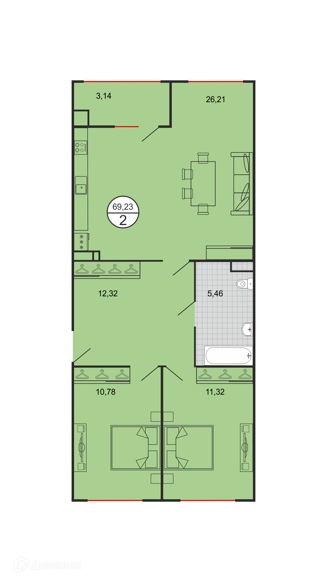 - Общая площадь: 69.23 м²