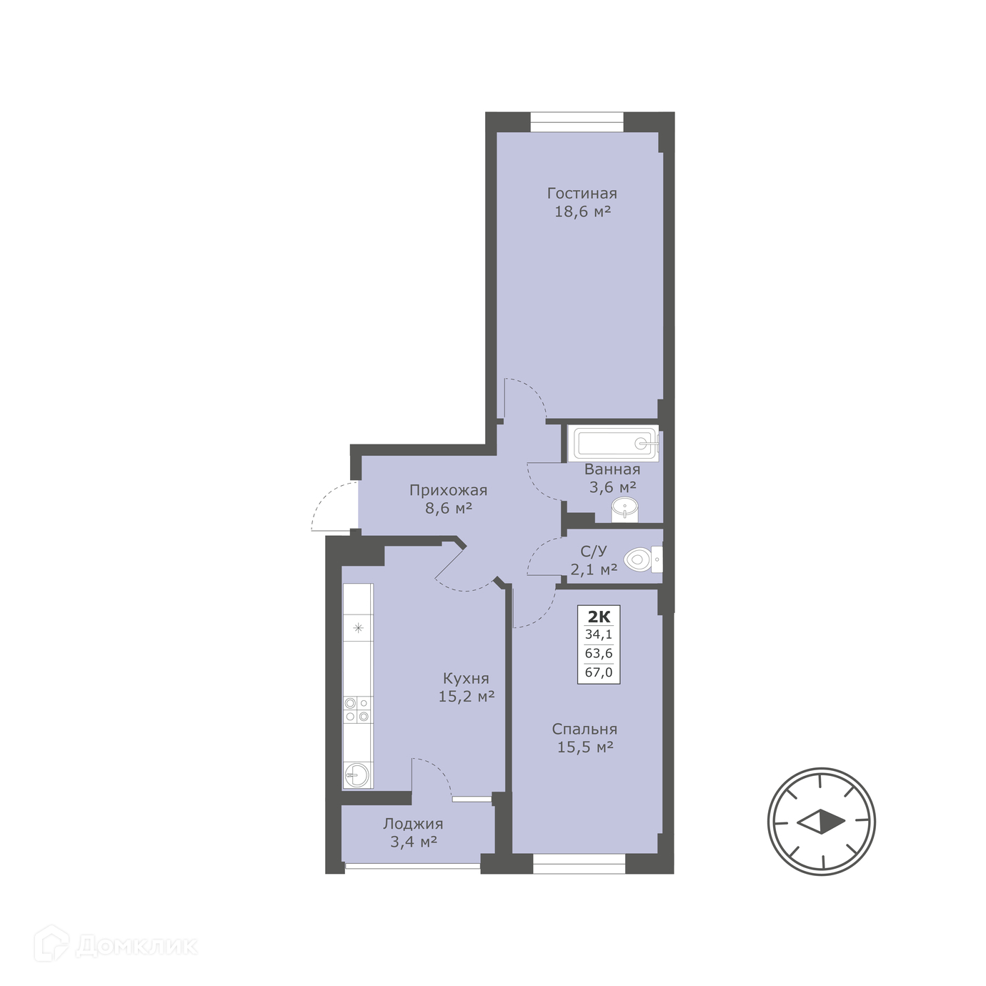 - ✅ Светлая жилая площадь: 34.1 м².