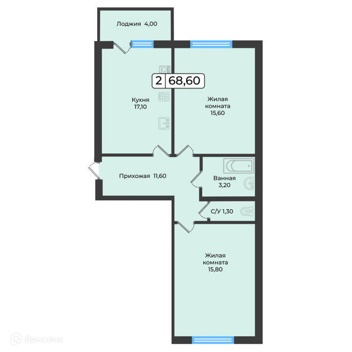 - Общая площадь: 68.6 м²