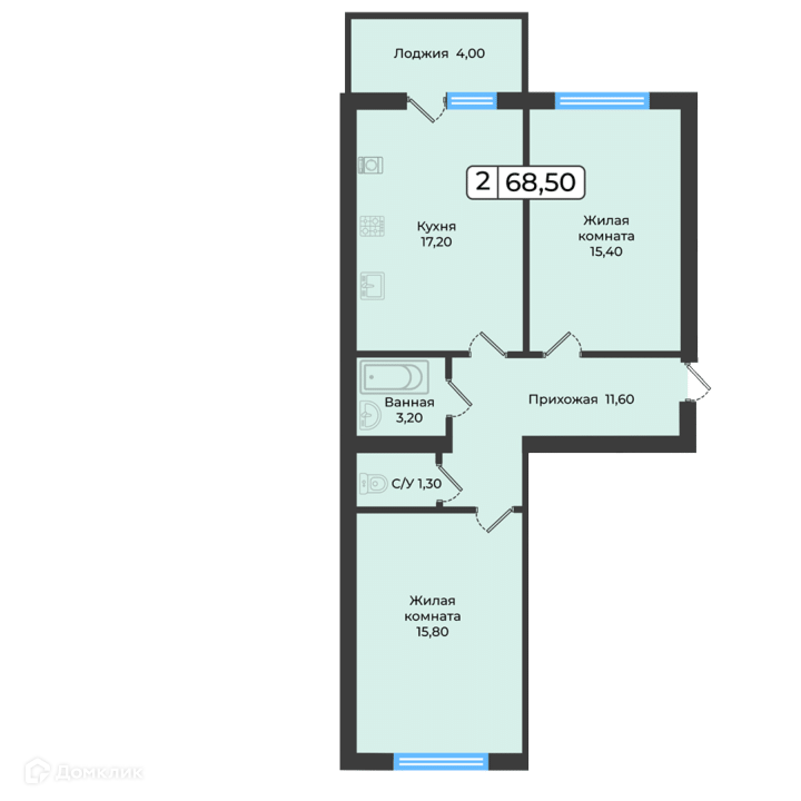 - Общая площадь: 68.5 м²