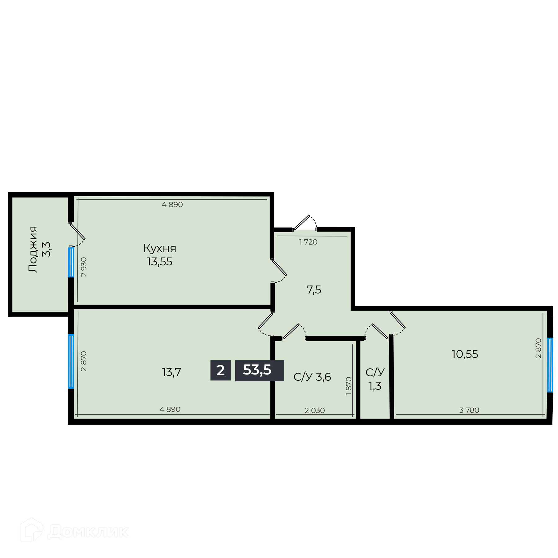 - ✅ Общая площадь: 53.5 м².