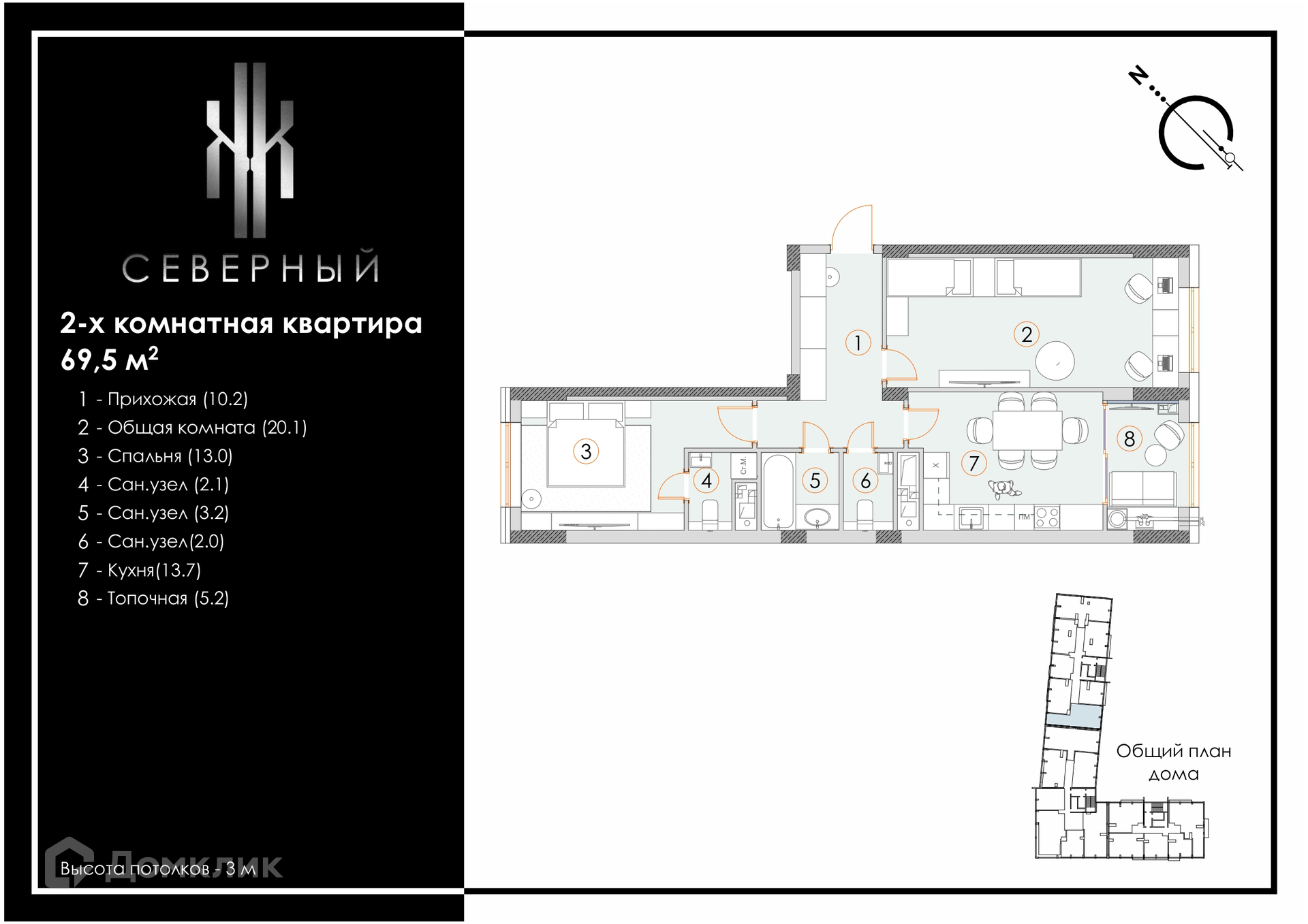 - Общая площадь: 69.5 м²
