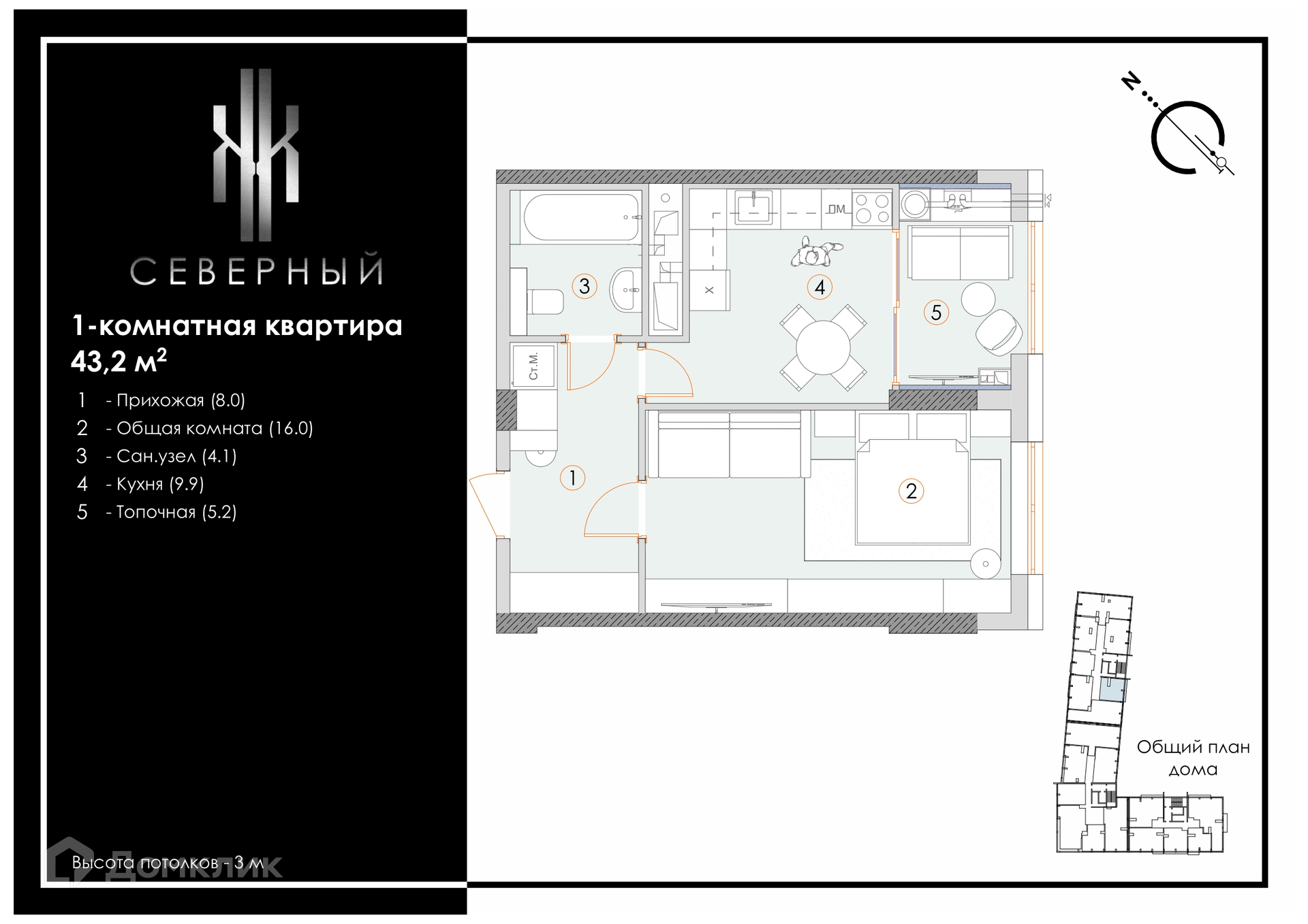 - Общая площадь: 43.2 м²
