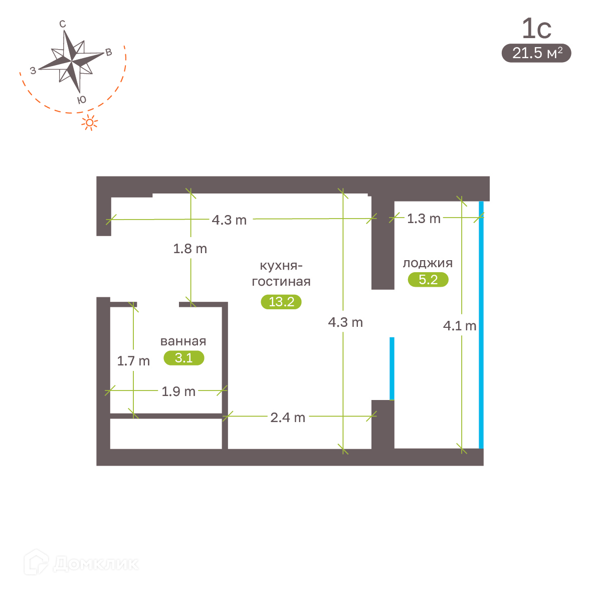 - ✅ Общая площадь: 21.5 м².