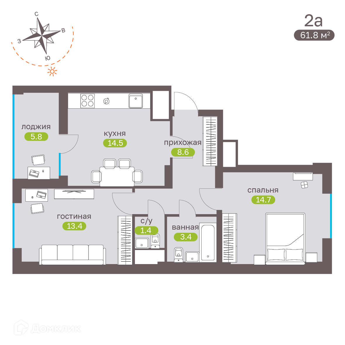 - Общая площадь: 61.6 м²