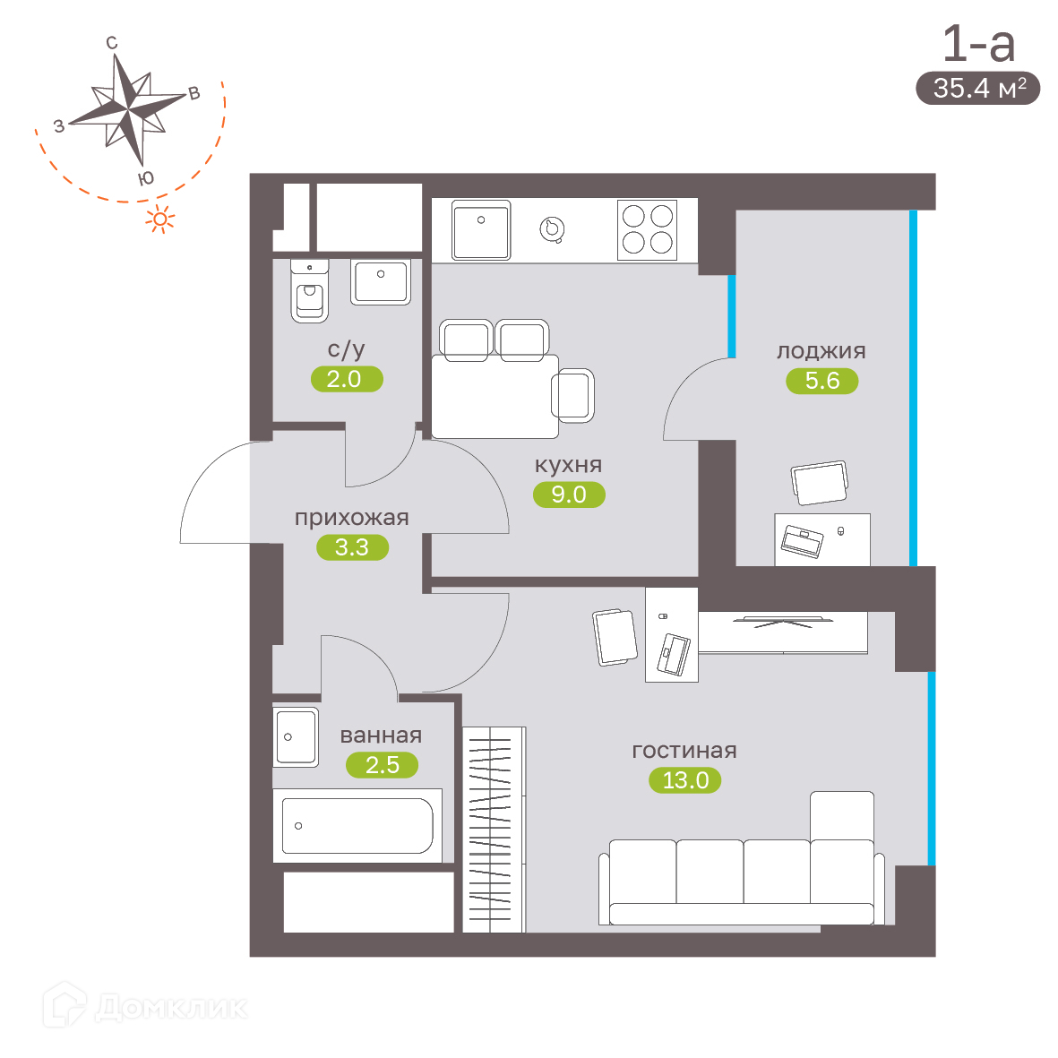- Общая площадь: 35.4 м²