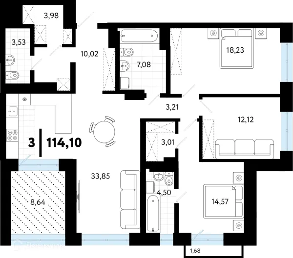 3 комн. квартира в Тюмени в ипотеку от 92 820 руб/месяц