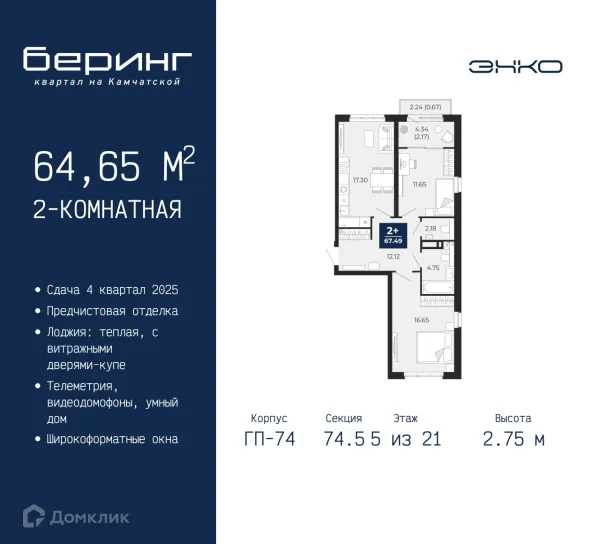 2 комн. квартира в Тюмени в ипотеку от 65 961 руб/месяц